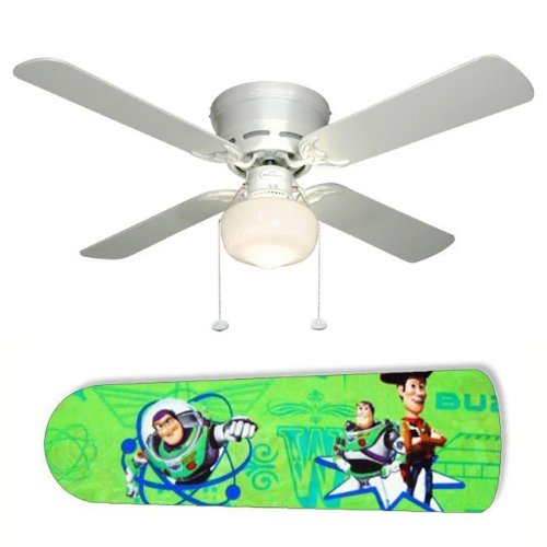 4 Blade ceiling fan with a schoolhouse light kit and custom design blades and will be shipped in original box. It is white with a flushmount design and is adjustable for downrods if needed. This fan features a 3-speed reversible airflow for energy efficiency all year long. Comes with Light kit and cNew Image Concepts 2998 42 in. Ceiling Fan with Lamp - Woody and Buzz Toy Story Do not Miss!! 4 Blade ceiling fan with a schoolhouse light kit and custom design blades and will be shipped in original box. It is white with a flushmount design and is adjustable for downrods if needed. This fan features a 3-speed reversible airflow for energy efficiency all year long. Comes with Light kit and c... New Image Concepts 2998 42 in. Ceiling Fan with Lamp - Woody and Buzz Toy Story
